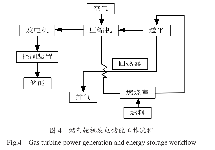 燃?xì)廨啓C(jī)發(fā)電儲(chǔ)能是通過燃料供給系統(tǒng)將天然氣輸送到燃燒室。天然氣在燃燒室內(nèi)與空氣混合燃燒,產(chǎn)生高溫高壓的燃?xì)狻_@些高溫高壓的燃?xì)庋杆倥蛎?并流經(jīng)透平葉片, 推動(dòng)透平旋轉(zhuǎn)。透平葉片通過軸連接到發(fā)電機(jī),透平的旋轉(zhuǎn)帶動(dòng)發(fā)電機(jī)的轉(zhuǎn)子旋轉(zhuǎn),從而在定子中產(chǎn)生電流,完成電能的轉(zhuǎn)換。最終將電能儲(chǔ)存到儲(chǔ)能系統(tǒng)中,以便在電力需求高峰期或電網(wǎng)出現(xiàn)故障時(shí)進(jìn)行釋放和使用。如圖4所示。在燃?xì)廨啓C(jī)發(fā)電儲(chǔ)能過程中,儲(chǔ)能系統(tǒng)可以幫助平衡燃?xì)廨啓C(jī)發(fā)電的輸出波動(dòng)。燃?xì)廨啓C(jī)的啟動(dòng)和停止時(shí)間較長,且燃料燃燒效率和發(fā)電效率容易受環(huán)境溫度和負(fù)荷變化的影響。通過儲(chǔ)能系統(tǒng)的調(diào)節(jié),可以在短時(shí)間內(nèi)補(bǔ)償輸出功率的波動(dòng),確保電網(wǎng)的穩(wěn)定運(yùn)行。在負(fù)荷較低時(shí),燃?xì)廨啓C(jī)的效率較低, 部分燃料會(huì)被浪費(fèi)。儲(chǔ)能系統(tǒng)可以在這種情況下存儲(chǔ)多余的電能,并在電力需求高峰期釋放,減少燃?xì)廨啓C(jī)的啟動(dòng)和停止次數(shù),從而提高整體的能源利用效率。
