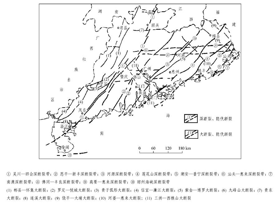 廣東省在大地構(gòu)造上屬華南褶皺系的一部分,其演化過程經(jīng)歷了三個發(fā)展階段及相應(yīng)的構(gòu)造旋回和構(gòu)造運動:加里東運動形成緊密線型褶皺,主要呈NEE方向,成為廣東省構(gòu)造骨架的基礎(chǔ);印支運動形成多方向的過渡型蓋層褶皺;燕山運動以斷塊造山、NE向和EW向深大斷裂控制的火山噴發(fā)、巖漿侵入為主。深大斷裂對廣東省的沉積建造、巖漿活動、變質(zhì)作用和成礦作用有較明顯的控制。主要的深斷裂有吳川-四會、恩平-新豐、河源、蓮花山、潮安-普寧、汕頭-惠來、南澳、佛岡-豐良、高要-惠來、瓊州海峽等,主要的大斷裂有郴縣-懷集、羅定-悅城、貴子、信宜-廉江、紫金-博羅、九峰山、貴東、遂溪、饒平-大埔、河婆-惠來、三洲-西樵山等。這些深大斷裂都具有規(guī)模大、活動時間長等特點。從總體上看。廣東省境內(nèi)大型褶皺和深大斷裂以NE向為主,間夾EW向和NW向構(gòu)造組成復雜的構(gòu)造圖景。