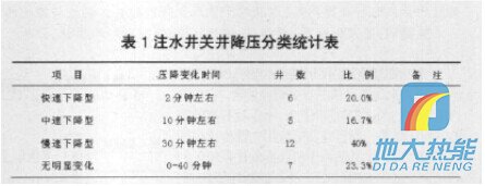 為確定合理降壓時間,在我隊30口注水井洗井過程中觀察注水井壓力隨關(guān)井時間的變化,以短時間(60分鐘)壓力出現(xiàn)直線段或相對直線段統(tǒng)計,歸納總結(jié)如表1所示的幾種類型:快速下降型、中速下降型、慢速下降型、無明顯變化型。 根據(jù)調(diào)查統(tǒng)計結(jié)果,來確定不同類型的關(guān)井降壓時間:快速下降型的井只需關(guān)井3 ̄5分鐘;中速下降型的注水井需關(guān)井10 ̄15分鐘;慢速下降型的注水井需關(guān)井降壓30分鐘,無明顯變化型的注水井可直接洗井(洗井時應觀察壓降的變化)。為此關(guān)井降壓的最佳時間應該是壓降變化趨于穩(wěn)定的時間,較為合理。