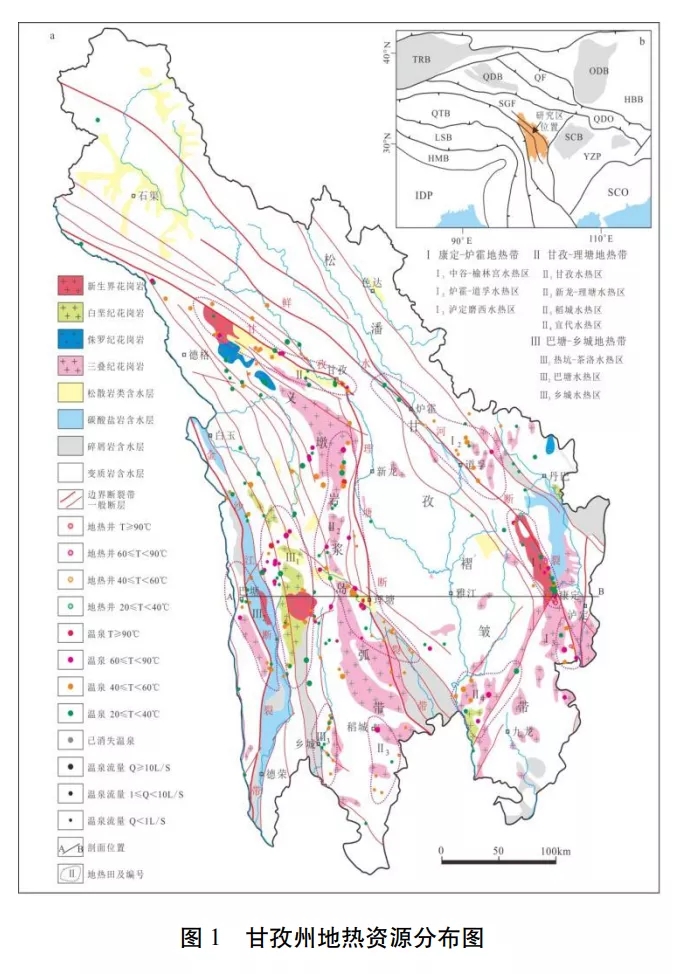 據(jù)最新調(diào)查成果,甘孜州的水熱活動強(qiáng)烈,全州共有溫泉點(diǎn)264 個,地?zé)峋?/a>17 口, 除色達(dá)縣外,其余17 縣均有水熱活動。 全州溫泉分布主要受 3 條深大斷裂帶和數(shù)條主要大斷裂(德格-鄉(xiāng)城大斷裂帶、玉科大斷裂帶、 陳支大斷裂帶等)控制,形成了3個主要地?zé)釒?/a>和9個水熱活動集中分布區(qū)的基本分布格局。水熱活動強(qiáng)烈區(qū)一般位于主干斷裂帶及其轉(zhuǎn) 折的部位,以康定縣、甘孜縣、理塘縣、巴塘縣 為典型代表。