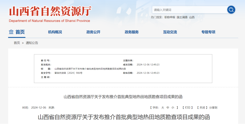 2024年12月6日,山西省自然資源廳官網(wǎng)發(fā)布了《山西省自然資源廳關(guān)于發(fā)布推介首批典型地?zé)崽?/a>地質(zhì)勘查項目成果的函》,旨在深入貫徹落實山西省委、省政府關(guān)于加快地?zé)豳Y源開發(fā)利用的工作部署要求,進(jìn)一步推動公益性地質(zhì)勘查成果與產(chǎn)業(yè)供需發(fā)展精準(zhǔn)對接,支持地?zé)峁┡?/a>有序替代。山西省自然資源廳初步篩選確定了首批典型地?zé)崽?/a>目錄清單及地質(zhì)勘查項目成果。
