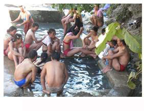 云南躍進(jìn)橋溫泉風(fēng)景澡堂會(huì)的熱水最高達(dá)70-80度,由于是自然溫泉,含有多種礦物質(zhì)和稀有金屬元素,對(duì)人體的某些疾患有特殊的療效,因而慕名前往洗浴的客人遠(yuǎn)到西藏也不乏大有人在,只是現(xiàn)在的時(shí)間主要是周邊的人們,到三、四月份就會(huì)有更多遠(yuǎn)方的西域者陸續(xù)到來。不少洗浴者一洗就是十天半月,更有甚者能洗兩到三個(gè)月,目的是治病,據(jù)說還真有不少人治好了疑難雜癥,不然的話怒江“澡堂會(huì)”怎么會(huì)在印度、尼泊爾、巴基斯坦、新加坡、馬來西亞甚至美國等地聞名遐邇。